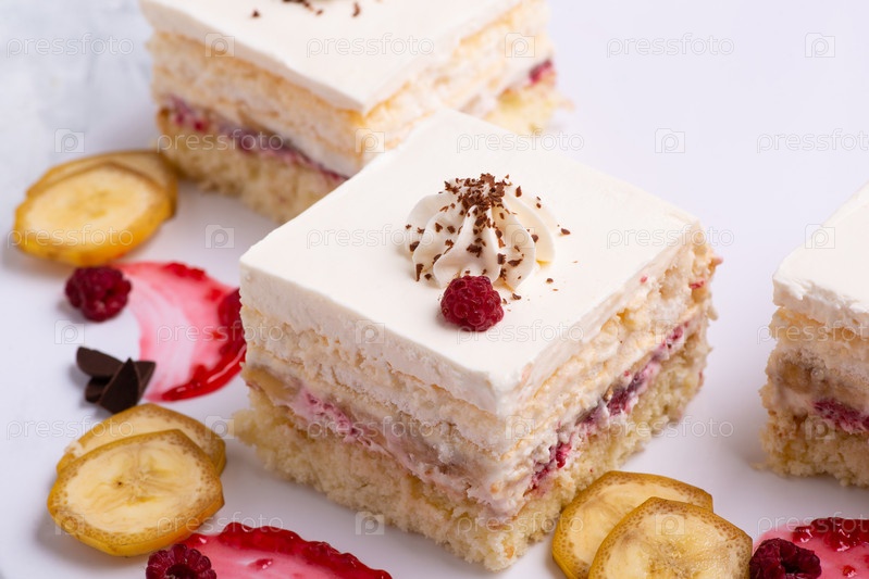 Порция вкусных кусочков фруктового ванильного торта на белой тарелке