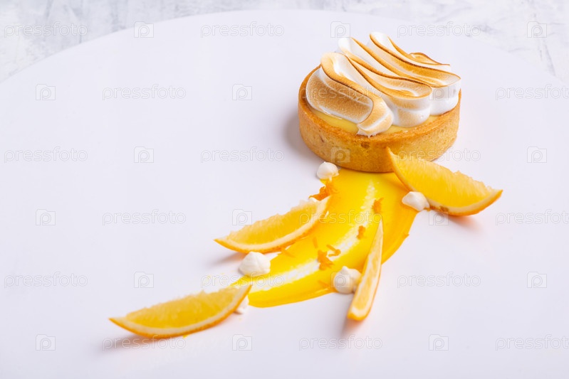 Аппетитные лимонные тарталетки с безе подаются на белой тарелке