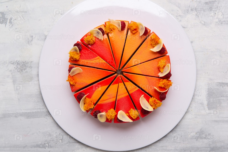 Вид сверху на нарезанные пирожные на белой тарелке