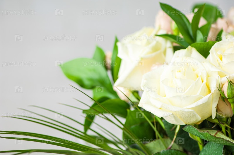 Крупный план красивых белых роз и зеленых листьев в букете