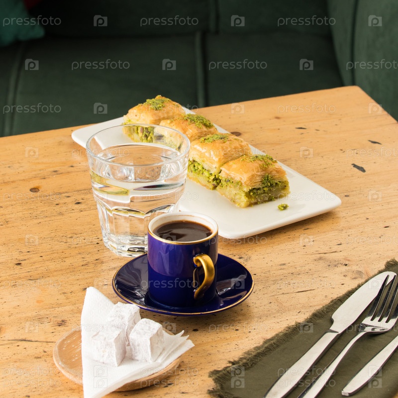 Чашка кофе возле стакана воды и пахлавы