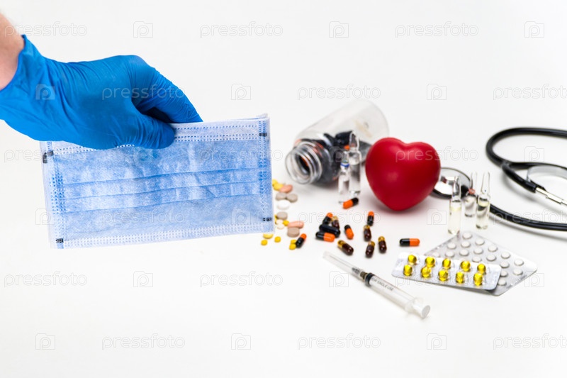 Крупный план руки человека в перчатках с медицинскими масками и лекарствами на столе