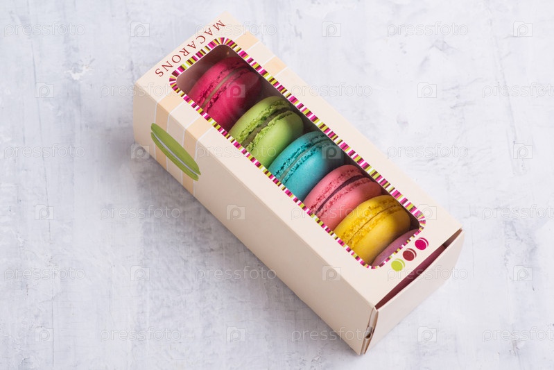 Угловой снимок красочных французских макарон, помещенных в симпатичную коробку с прозрачным верхом