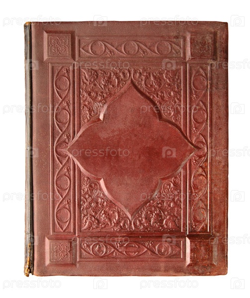 Вертикальный крупный план старого кожаного книжного шкафа с древним узором на белом фоне
