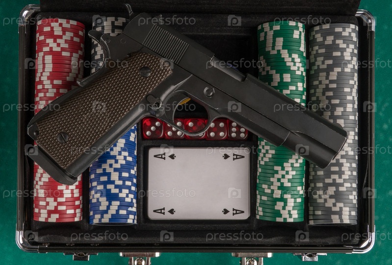 Верхний снимок оружия на открытом кейсе для покера на зеленой доске