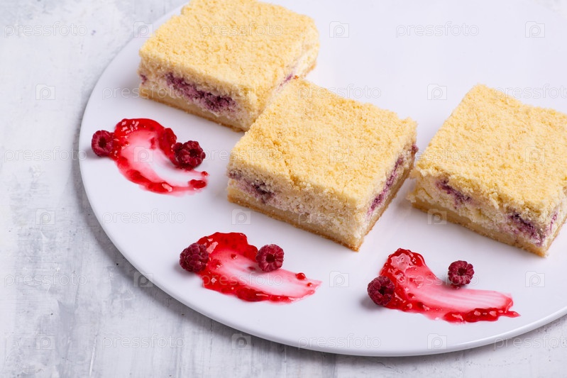 Порция вкусного ванильного малинового торта на белой тарелке