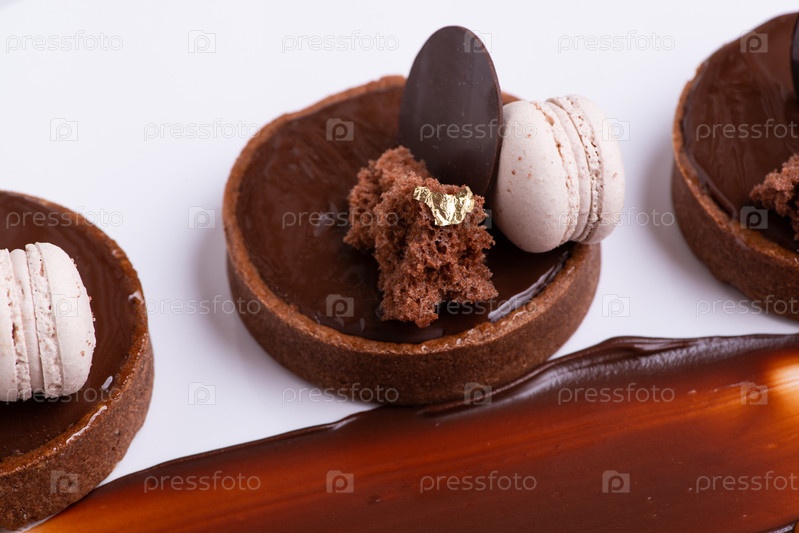 Крупный план вкусного шоколадного десерта с миндальным печеньем на белой тарелке