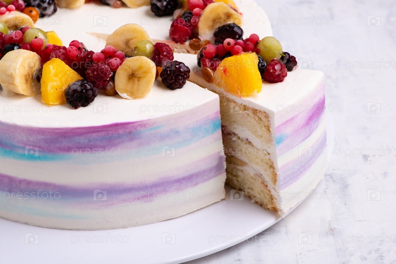 Вид сверху на фруктовый торт на белой тарелке