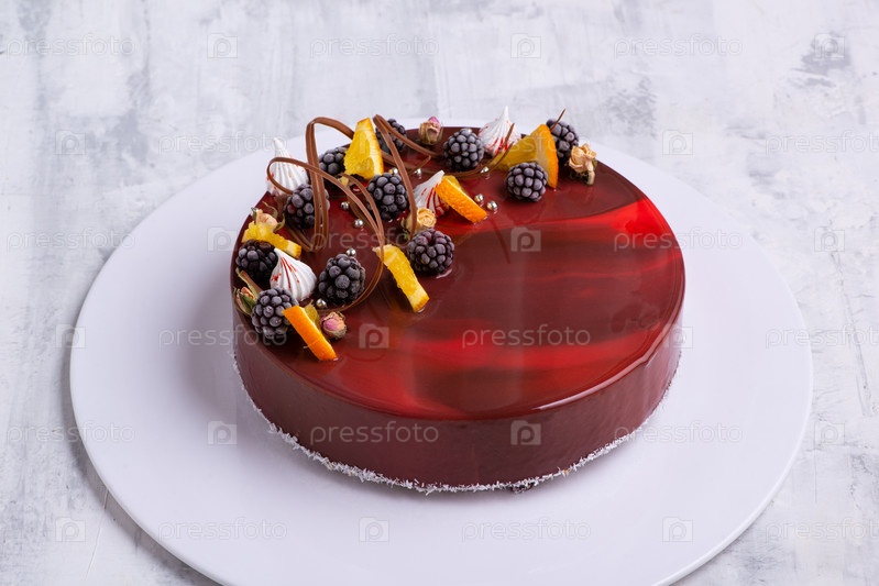 Крупный план вкусного торта с конфетами и свежими фруктами