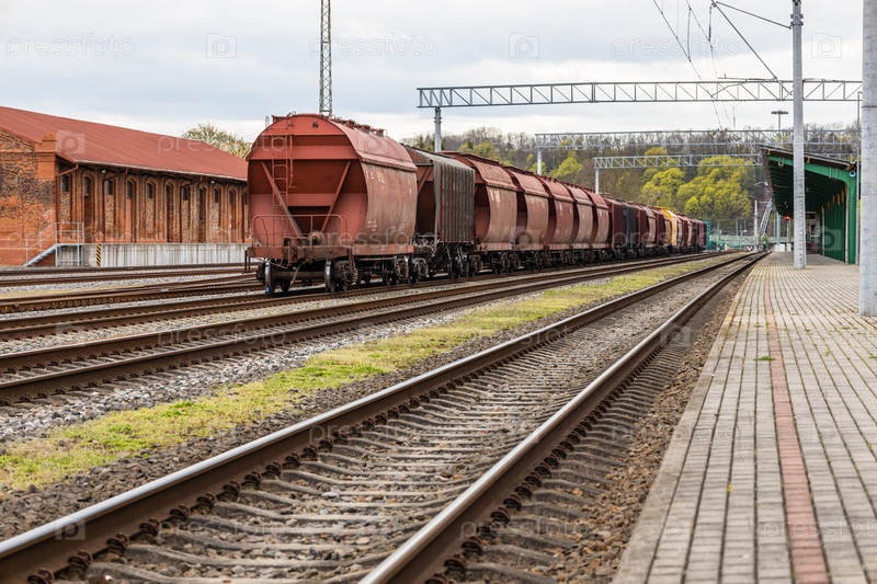 Платформа грузового поезда с контейнером. Железнодорожное депо