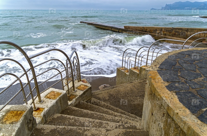 Лестница, спускающаяся на песчанный пляж. Сильный прибой достает до нижних ступенек. Судак, Крым. Конец апреля. Не сезон
