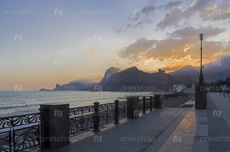 Вечер в Судакской бухте. Вид с набережной курортного города Судак в сторону поселка Новый Свет. Крым, конец апреля