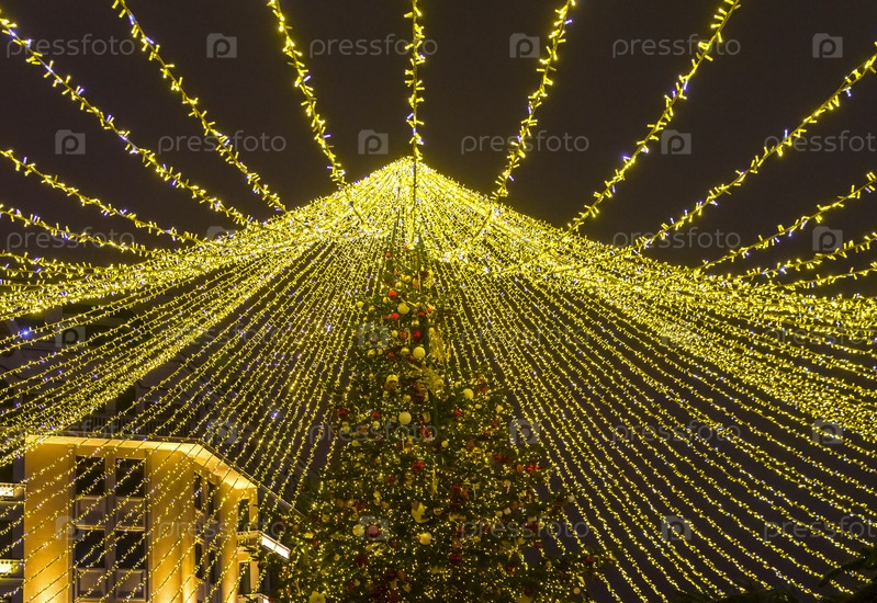 Большая новогодняя елка на открытом воздухе. Москва, Площадь Революции. Традиционный новогодний фестиваль "Путешествие в Рождество"