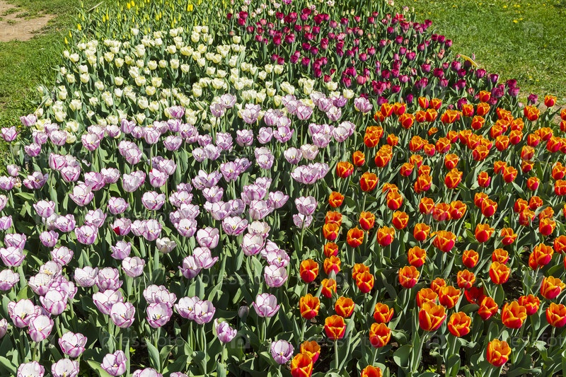 Красивые разноцветные тюльпаны на ярком весеннем солнцем