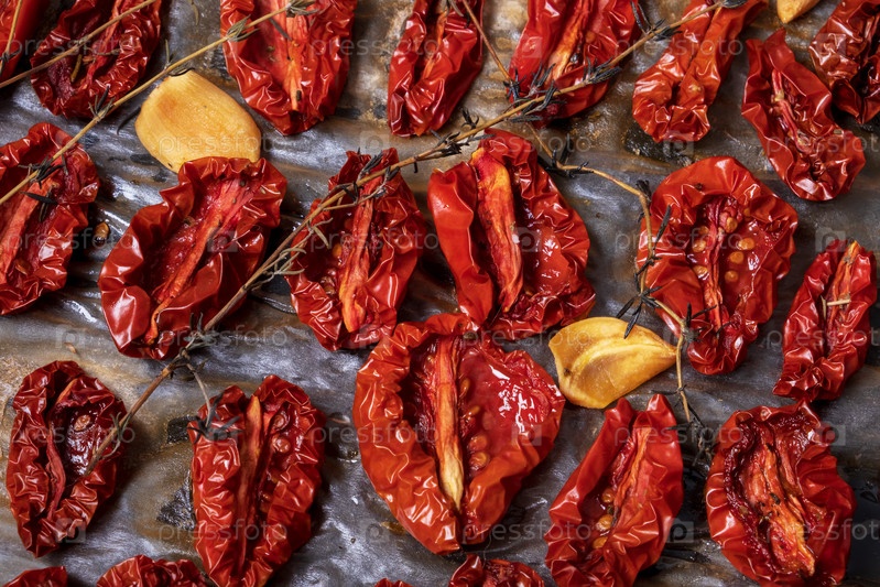Жареные в духовке вяленые помидоры на противне на пергаментной бумаге
