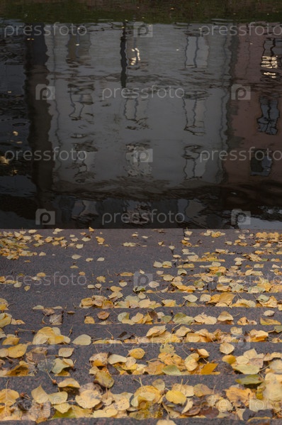 Желтая листва на лестнице на набережной осенью. дома отражаются в воде. Санкт-Петербург, Россия
