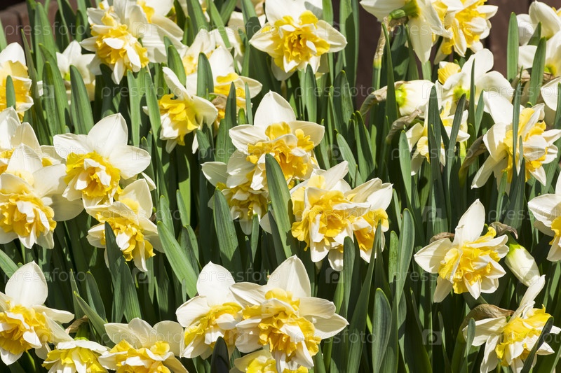 Красивые бело-желтые нарциссы на клумбе. Аптекарский Огород (филиал ботанического сада МГУ), Москва