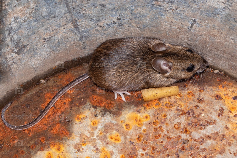 Маленькая домашняя мышь на ржавом металлическом фоне, крупный план