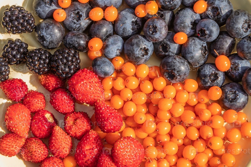 Смешанные разнообразные ягоды, собранные на участке, ягоды в ассортименте из ежевики, клубники, черники, облепихи. Красочная и здоровая концепция. Черный, синий, красный, зеленый. крупным планом