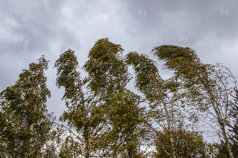 Сильный ветер гнет стволы деревьев и срывает листья. Ранняя осень. Тульская область, Россия