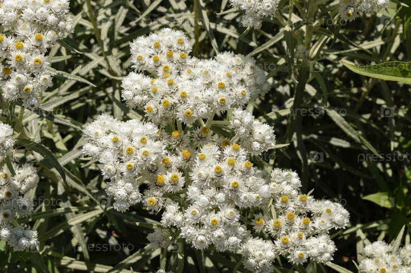 Anaphalis или triplinervis жемчужная вечная, много белых цветов на заднем плане. крупный план