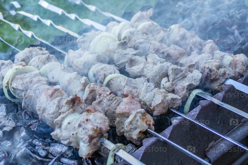 Здоровое мясо барбекю на шампурах над мангалом на открытом воздухе