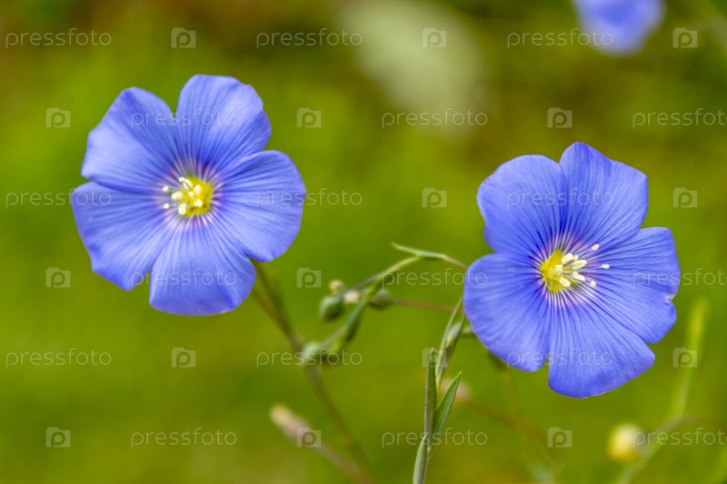 Голубые цветы льна на клумбе, лето, крупный план