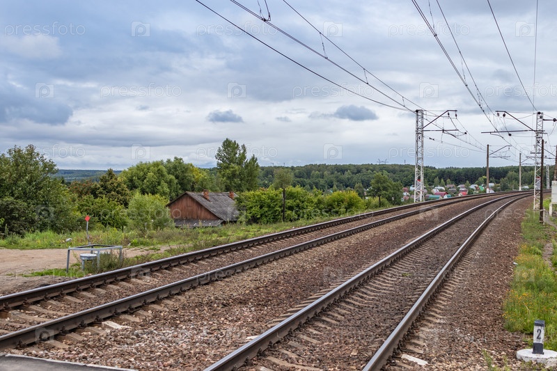 Железная дорога в Тульской области, Россия. пейзаж с железнодорожным полотном, небо с облаками, деревьями и травой. железнодорожный узел. путешествовать. никто. транспорт
