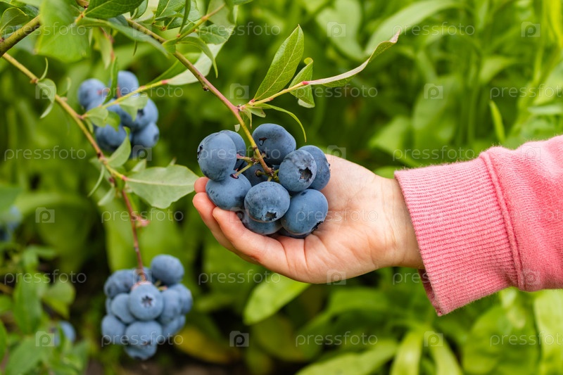 Садовый голубь вкусная, полезная ягода. Vaccinium corymbosum, черника. Рука ребенка держит кучу синих спелых ягод. крупный план