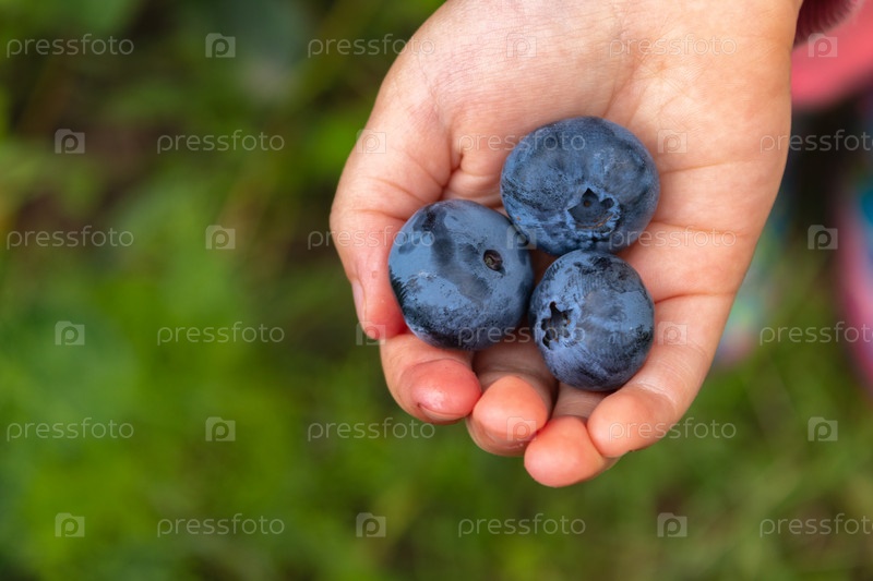 Садовый голубь вкусная, полезная ягода. Vaccinium corymbosum, черника. Рука ребенка держит кучу синих спелых ягод. крупный план
