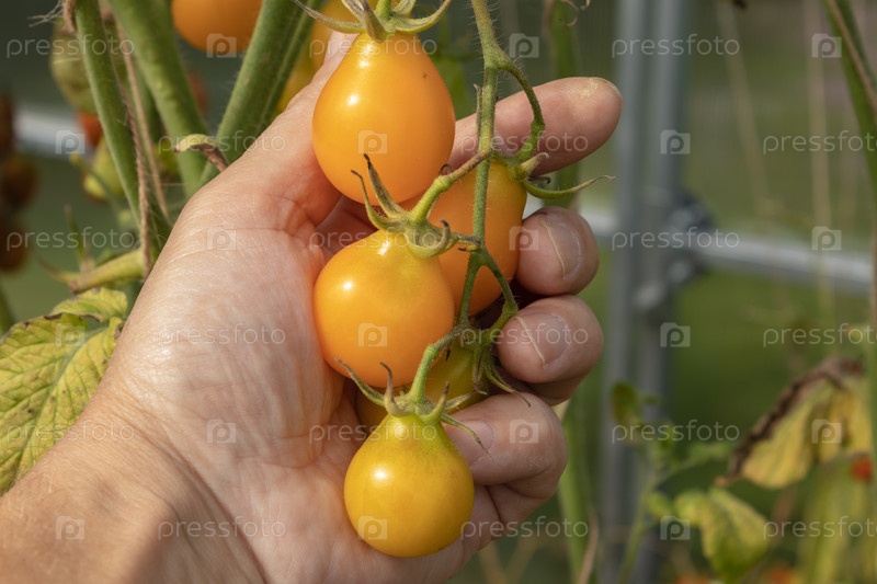 Спелые помидоры растут в теплице. Вкусные желтые помидоры семейной реликвии. крупным планом
