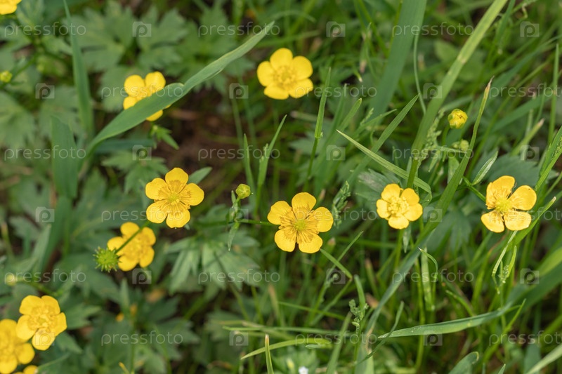 Ветка желтых цветов на фоне зеленой травы Ranunculus acris, луговый лютик, высокий лютик