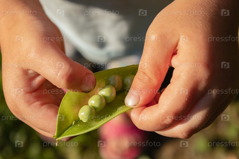 Маленький ребенок держит в руках стручок зеленого горошка. свежая летняя еда. счастливое детство. вид сверху