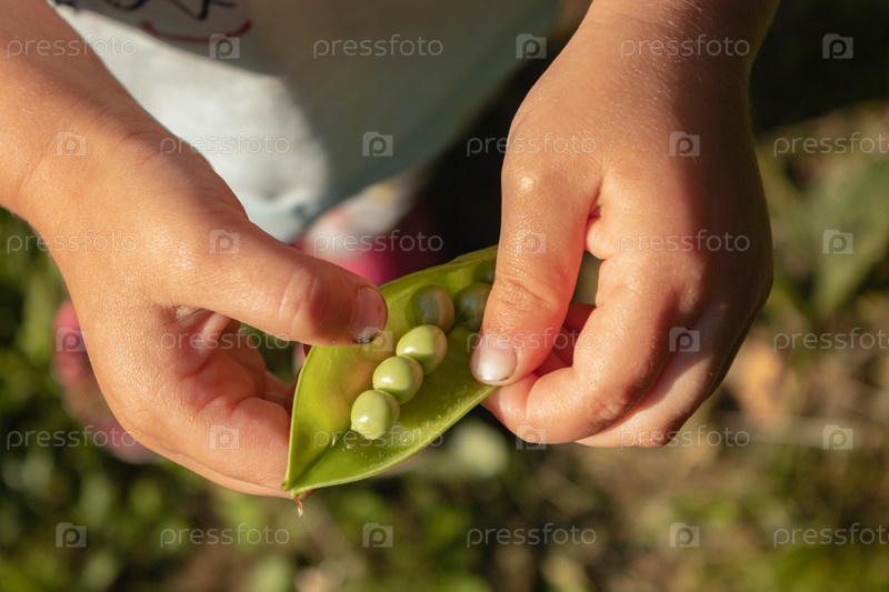 Маленький ребенок держит в руках стручок зеленого горошка. свежая летняя еда. счастливое детство. вид сверху