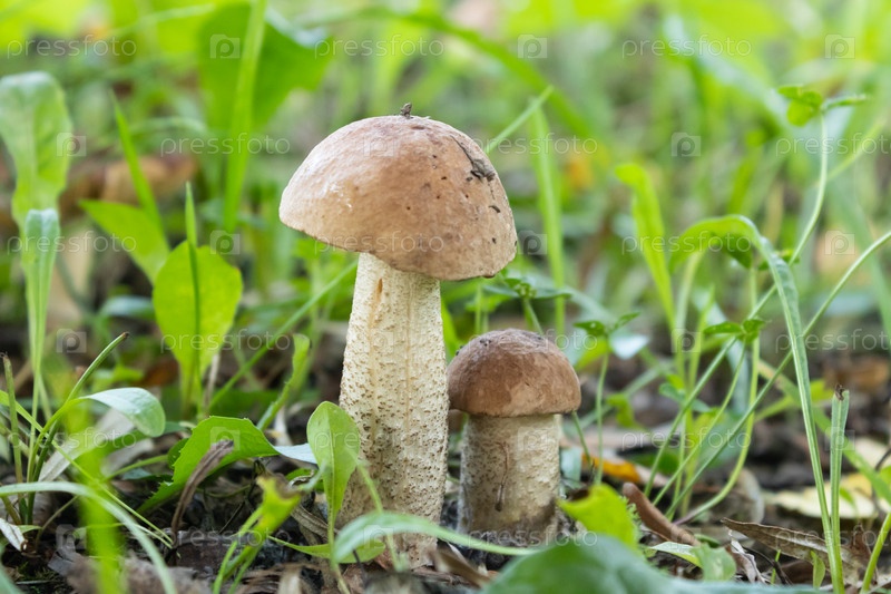 В лесу растут два гриба. Молодой подосиновик. Грибы в траве. Охота за грибами. Сбор грибов. Тульская область, Россия