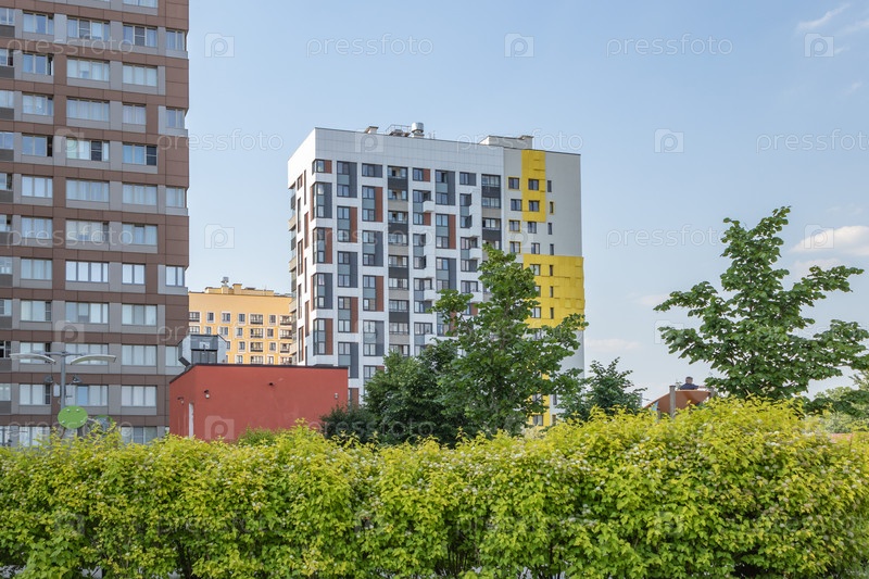 Современный многоквартирный дом с красочными фасадами на окраине города. Жилой комплекс «В лесу», Москва, Россия