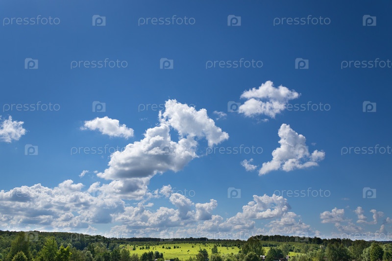 Яркий летний пейзаж с голубым небом. Зеленые поля в сельской местности. Московская область, Россия