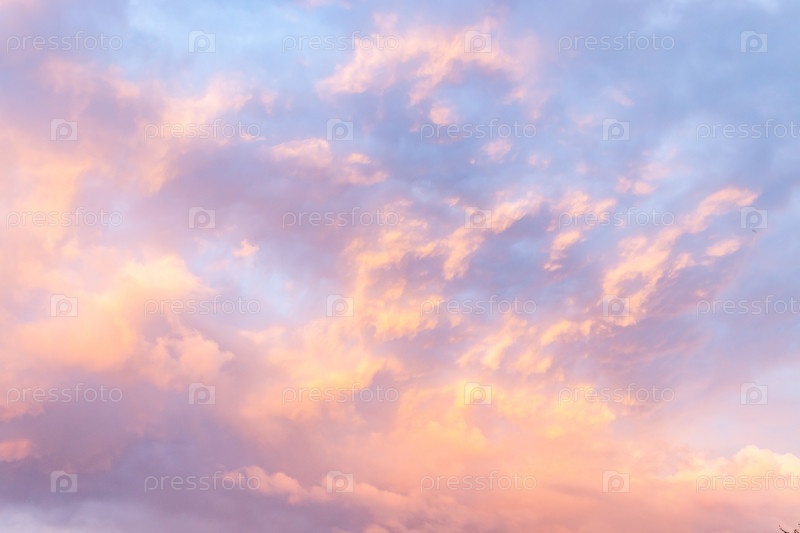 Красивое вечернее облачное небо с небольшой освещенной территорией. Розовые теплые облака на закате. Красочный фон вечерних облаков