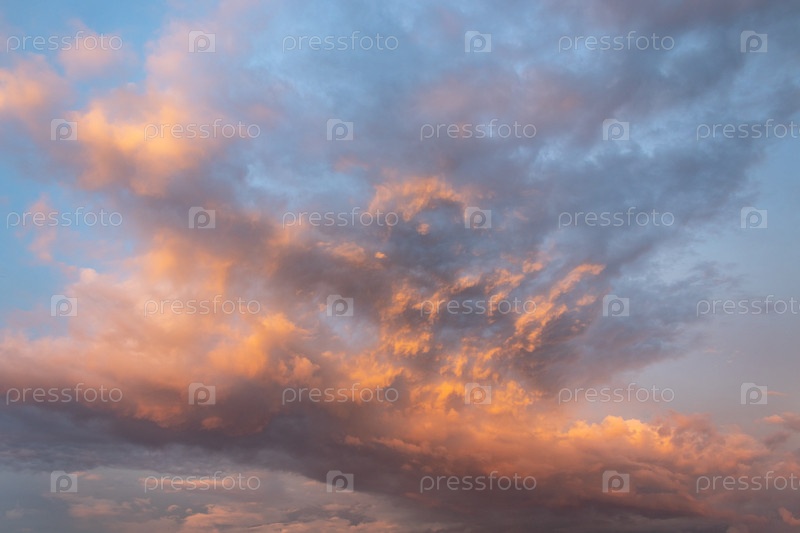 Красивое вечернее облачное небо с небольшой освещенной территорией. Розовые теплые облака на закате. Красочный фон вечерних облаков