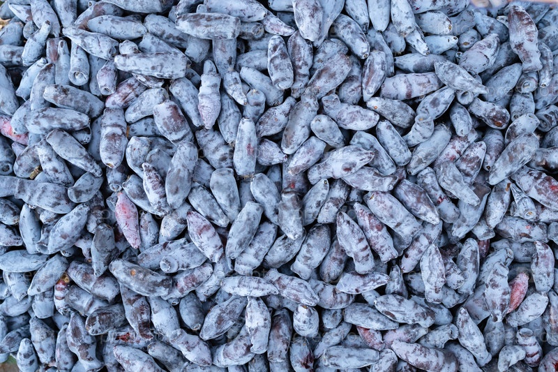 Первые спелые ягоды жимолости. На заднем плане много ягод. крупным планом