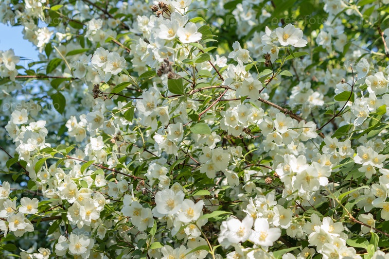 Ветки с белыми цветами жасмина, крупный план цветов жасмина в саду в солнечный день