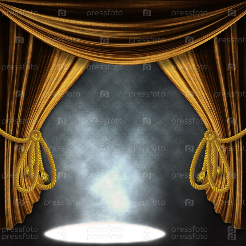 Сцена с золотым занавесом и прожектором