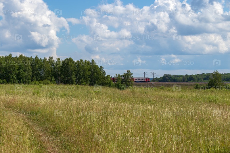 Яркий летний пейзаж с голубым небом. Проселочная дорога через поле в сельской местности. Московская область, Россия