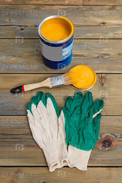 Банка желтой краски с кистью и перчатками, готовая к покраске. концепция ремонта и реконструкции, вид сверху