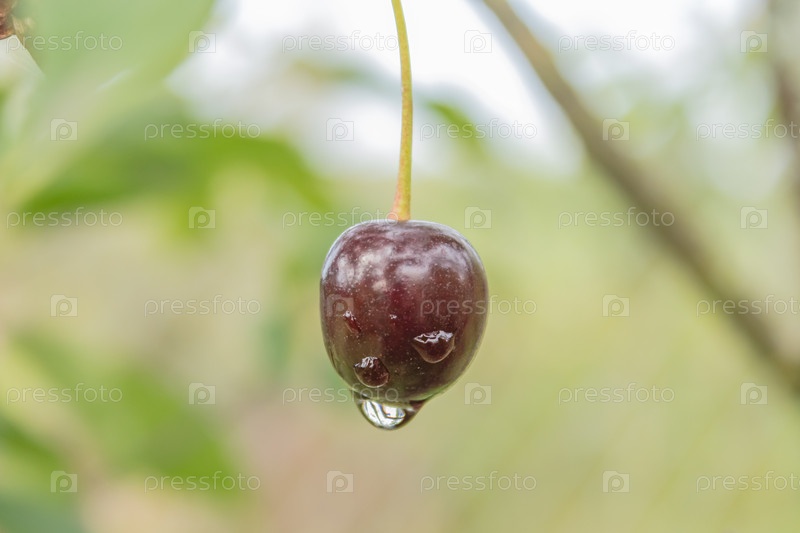 Спелая вишня с каплей дождя, крупный план