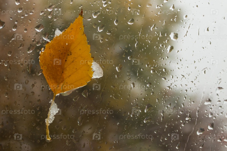 Желтый лист на мокром окне. снег и дождь за окном в осенний день. текстура капель дождя и снега, мокрое стекло. осенний натюрморт, крупный план