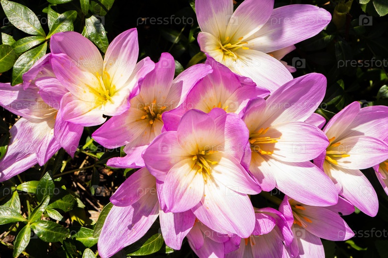 Безвременник фиолетовый растет в саду. Красивый цветущий фиолетовый безвременник осенний на естественном фоне. крупный план, вид сверху