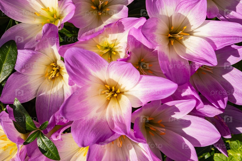 Безвременник фиолетовый растет в саду. Красивый цветущий фиолетовый безвременник осенний на естественном фоне. крупный план, вид сверху