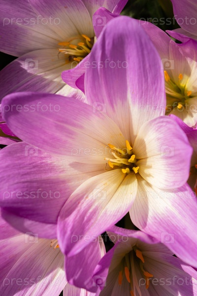 Безвременник фиолетовый растет в саду. Красивый цветущий фиолетовый безвременник осенний на естественном фоне. крупный план, вид сверху