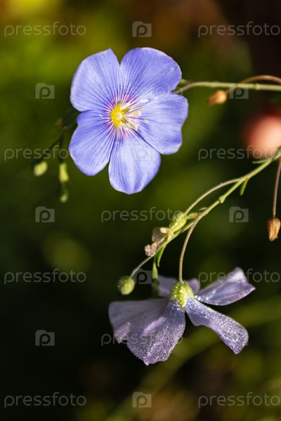 Голубые цветы льна на клумбе, лето, крупный план